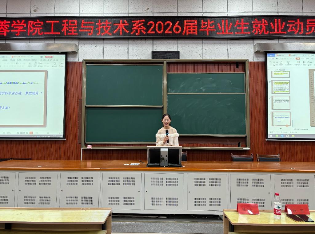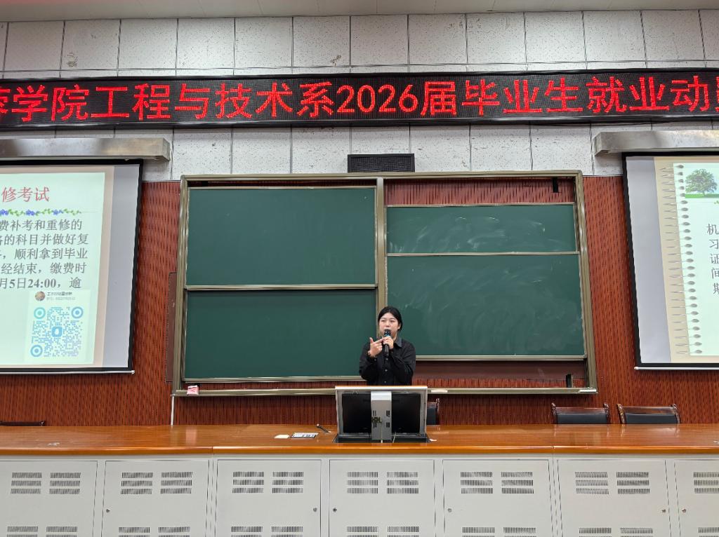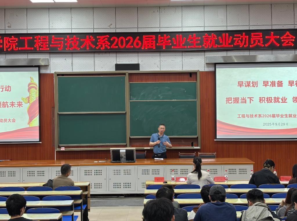 为全面做好2026届毕业生就业工作,充分调动毕业生就业积极性,工程与技术系于9月29日下午14:30在T3-D101教室召开2026届毕业生就业动员大会,芙蓉学院党委委员、副院长杨立军、芙蓉学院专职组织员、工学系负责人耿苇、常德学院金科教授、教务肖力元、毕业班辅导员王惠俊、张熠、童欣然及全体22级学生参与此次会议。