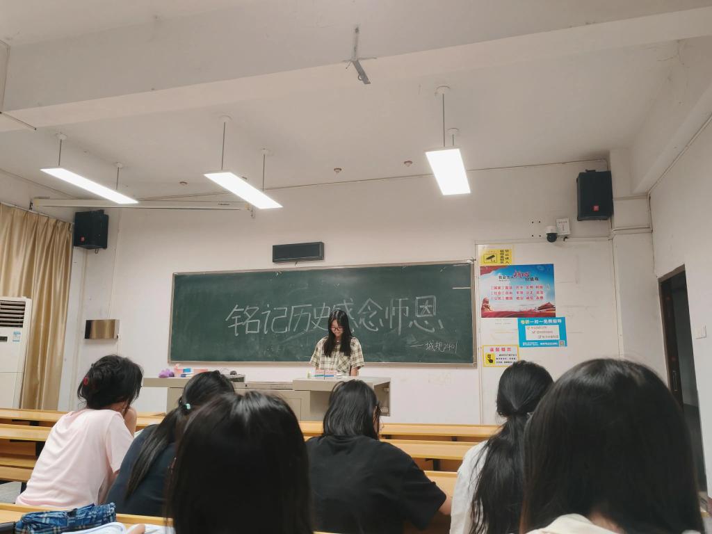 为了传承红色基因,弘扬爱国主义精神,提高政治意识和思想觉悟,明确自身在新时代的责任与使命,坚定理想信念,树立正确的世界观、人生观和价值观,我系各班团支部用晚自习时间在教室开展了以“铭记历史 感念师恩”的主题班会。